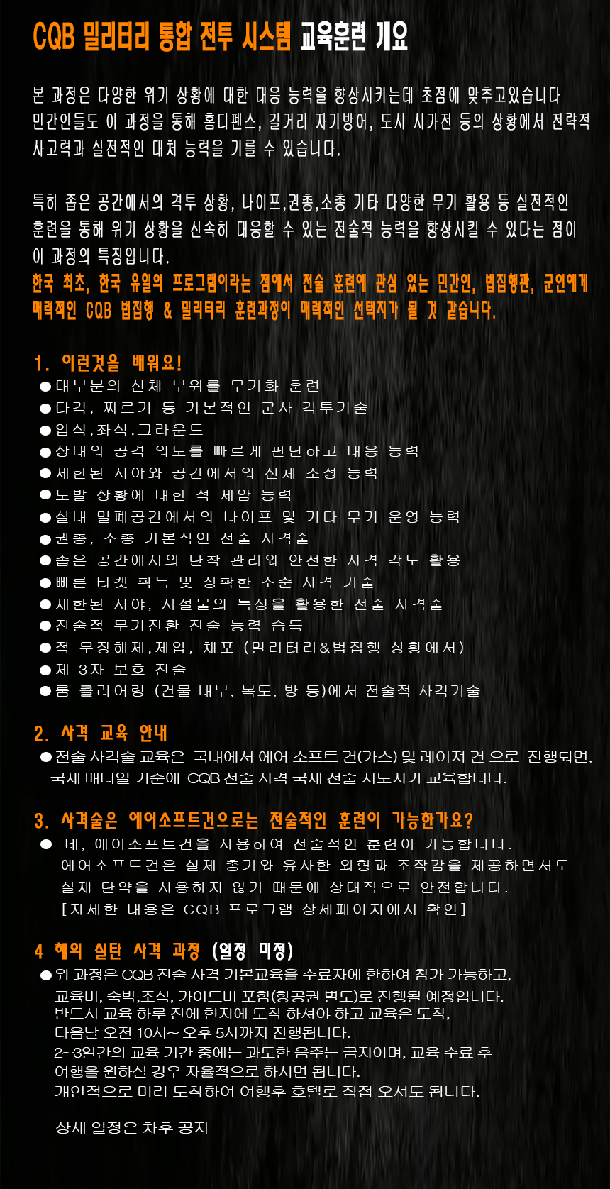본 과정은 맨손, 나이프, 전술사격 포함한 법집행 & 밀리터리 전술 훈련과정임.
