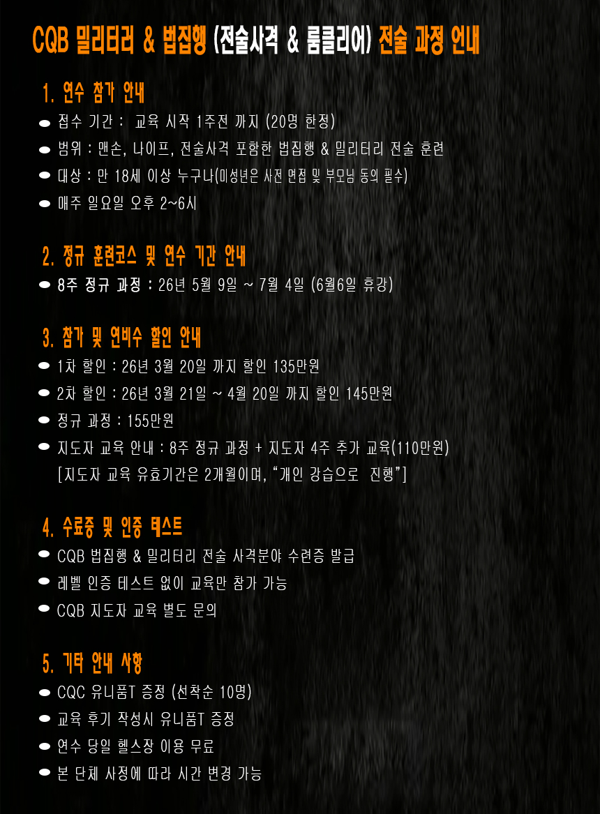 [26년 5~6월 오픈-사전 등록 할인 ] CQB 밀리터리&법집행 훈련 과정 (전술사격&룸클리어)