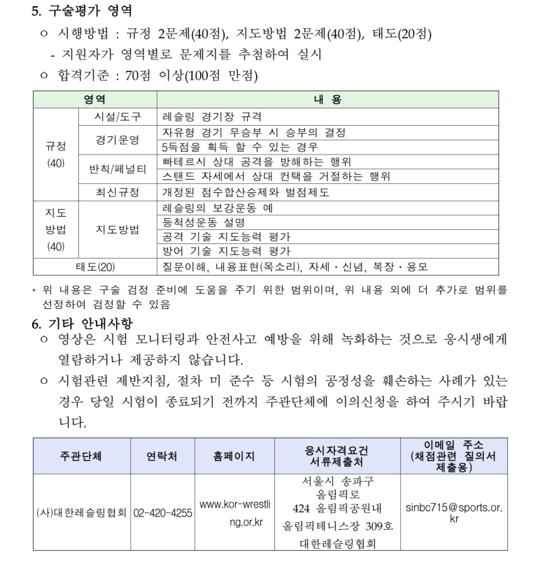 ◆ 레슬링 실기 평가 기술표 (주요 항목)